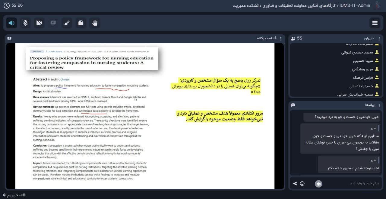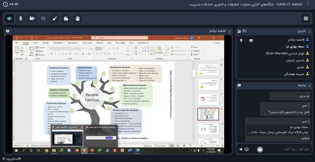 کارگاه  آشنایی با مطالعات مروری در روز چهارشنبه 5 آذر ماه 1404 با تدریس سرکارخانم دکتر فاطمه نیکنام (استادیار مدیریت اطلاعات سلامت)  و به همت کمیته تحقیقات و فناوری دانشجویی دانشکده مدیریت و اطلاع رسانی پزشکی دانشگاه علوم پزشکی ایران به صورت رایگان از ساعت 10 الی 12 و به صورت آنلاین در بستر اسکای روم برگزار شد.